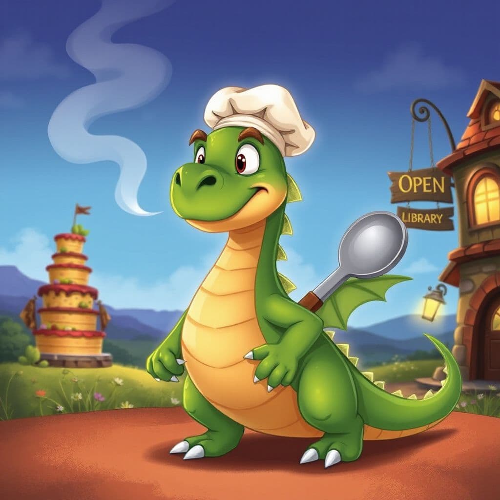 Flicker, a gentle dragon, dreams of baking the biggest cake ever, but his fiery breath makes it tricky! Can he bake a delicious masterpiece without a single singe?